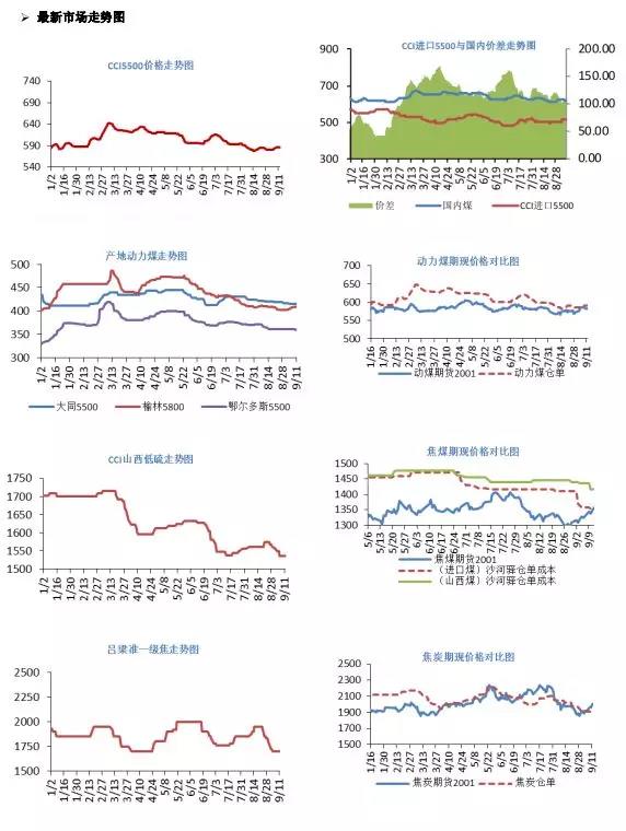 部分焦企提漲焦炭出廠價(jià)100元/噸,上下游目前多觀望市場。焦企方仍保持積極出貨,廠內(nèi)焦炭庫存盡量維持低位或無庫存狀態(tài),而鋼企方面目前到貨保持平穩(wěn),暫未出現(xiàn)補(bǔ)庫或減量的情況。市場預(yù)期看漲看跌均有,整體看,看漲者居多。截至9月17日,汾渭呂梁準(zhǔn)一級焦1700元/噸,日環(huán)比持平;唐山準(zhǔn)一級焦1910元/噸,日環(huán)比持平;日照港準(zhǔn)一級焦1870元/噸,日環(huán)比持平。